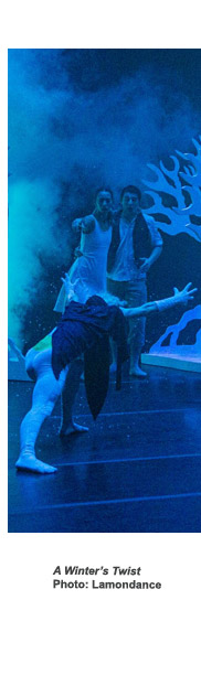 Company When & Where December 17 & 18, 2021, 7:30pm | BlueShore Financial Centre for the Performing Arts, North Vancouver Artistic Director Davi Rodrigues Set Design Ravi Rodriques Costume Design Racheal Prince and Ravi Rodriques Light Design Brad Trenaman Music Brandon Alley (original score), Rene Dupere, Mikael Karlsson, Alan Watts, Only Men Aloud!, Patrick Doyle and Jean-Francois Cote, Pato Fu and Ennio Morricone. Reviewer Nancie Ottem Lamondance departed from the structure of previous productions with A Winter’s Twist. For example, Marbled in 2018 and Viva in 2019 offered separate dance pieces centered on a theme within the framework of an evening. With A Winter’s Twist, Rodriques has created a Christmas story that unfolds over the course of the two act production. Taking inspiration from traditional ballets, Nutcracker and Romeo and Juliet, Rodrigues has crafted a story that is filled with dance, gymnastics and theatre. He has filled A Winter’s Twist with the innocence of young love portrayed so believably by Elina Lucky and Benedict Quedenbaum, humour through the pantomime of the character The Twisted, performed brilliantly by Matt Bryce and the breathtaking gymnastic feats of the Goddess of Love, Brooklyn Wiseman. Polar bears, snowball creatures, deadly flowers and wolves add delight for children and adults alike in this Christmas production. There is clever innovation threaded throughout A Winter’s Twist starting with the tableau enacted by the dancers/actors pre-curtain which engaged the audience so effectively, the opening monologue of The Twisted, the winder that The Twisted used to raise the curtain, the clever use of minimal costuming to create a big visual impact and the white trees used so effectively by the white body suited tree roots creating tension during the wolves attack to name just a few. The music that accompanied each segment of the story worked to enhance the emotion of each scene extremely well. The whimsical, childlikeinnocence of Juliet as she performed a solo in front of Romeo’s Christmas window was enchanting. The powerful choreography of the Montagues vs Capulets dance paired dramatically with the throb of the music creating tension in the piece were standouts. The pas de deux by Juliet (Elina Lucky) and Romeo (Benedict Quedenbaum) were technically well executed while also delivering honest emotion. A Winter’s Twist is a welcome addition to Christmas entertainment. A pity it only has a two day run. © 2021 Nancie Ottem |