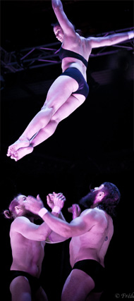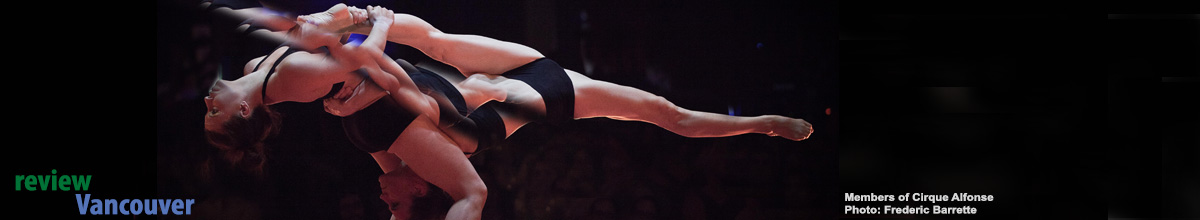 Montreal based Cirque Alfonse is back in Vancouver for the second time in three years with Barbu, a retro circus spectacle that harkens back to carnivals of bygone years and the weird and wonderful sideshows that was always a vital part of them. The Carabinier-Lépine family circus company was likely named after the town of Saint-Alphonse-Rodriguez in central Quebec where it was founded twenty years ago. The seven superbly fit artists, five hairy gentlemen and two athletic ladies, perform in a typical black box set with an elevated stage for the trio of musicians. Four temporary rows of seating have been added to the stage floor (two each side) just for this production. The performers always appear to need more room, but there were no unintended encounters with members of the audience on opening night. Barbu is a quirky and inventive seventy-five minute show that involves juggling, acrobatics and comedy. The live music is essentially French-Quebecois which actually adds to the show’s inherent theme. While each performer provides a dazzling demonstration of their special skills – for example, it’s the oldest member Lucas Jolly that typically delivers the physical comedy – some members are able to cross-over into other roles. Laura Lippert (the only American in the group) and Geneviève Morin display courage and confidence being thrown in the air and caught just before hitting the floor. Laura Lippert goes through an aerial dance maneuver while hung from a trapeze rope by her hair. Geneviève Morin disappears from a locked cabinet, then reappears some moments later almost naked. Barbu is very much a non-stop, high energy show, with the pace never showing signs of dropping off. Following the performance, the artists made themselves available for a ‘meet-and-greet’ with the audience. © 2024 John Anthony Jane |