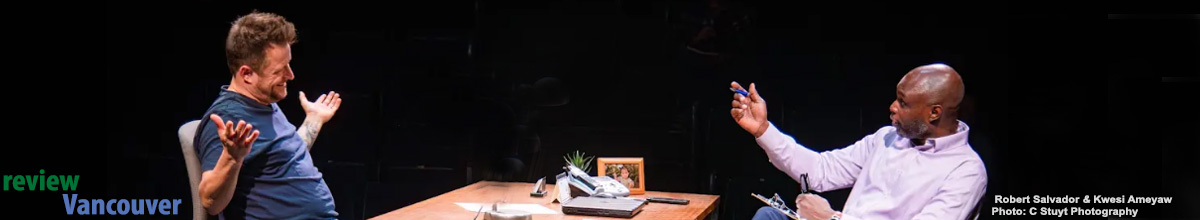 Samuel D. Hunter’s two-handed, single act play, A Case for the Existence of God opened last night (17/5/24) at the Pacific Theatre. The production was intelligently directed by Kaitlin Williams with Kwesi Ameyaw and Robert Salvador delivering powerful performances. Hunter’s play is set in Idaho in roughly present time and simultaneously offers the lightness of comedy and the heaviness of drama. The play centres around two men in their early forties and both fathers. That appears to be where their similarity ends. Keith is black, gay and well-educated; Ryan is white, straight, soon to be divorced and undereducated. The two men had presumably met at a dare care prior to any action seen on stage. Despite their apparent differences, over the course of several meetings that initially focused on Ryan’s need for a mortgage, they freely divulge personal details about their circumstances. They gradually become comfortable discussing family, relationships and travel. At this point, Ryan profoundly suggests that “I think we share a kind of sadness.” Certainly Ryan, and through different circumstances, Keith are each afraid of having to give up their daughter. Kwesi Ameyaw as the uptight Keith and Robert Salvador as the feckless Ryan skillfully play off each other’s character, keeping the audience guessing as to which ones emotions will spill over first. Alaia Hamer’s single set of Keith’s Mortgage Brokerage office consisting of a simple desk and a chair on either side of the desk mounted on an elevated platform to indicate the limited space. Even when the action takes place elsewhere, the office is ubiquitary. While the association of these two men is spread over weeks and eventually months, Jennifer Milley’s single purpose clothing might suggest a much shorter time frame. Would not a costume change be warranted at least for the final outdoor scene? In the house program, director Kaitlin Williams challenges the audience (at least those who read it) to suggest the meaning of the play’s rather provocative title. I think if it was intended as a theological argument it may have been better called A Need for the Presence of God. However, Ryan and Keith do not themselves have much of a handle on the situation and it seems unlikely that either man places any such trust in an almighty power, it is feasible that Samuel D. Hunter declares on their behalf that there is really no case for God’s existence. © 2024 John Anthony Jane |