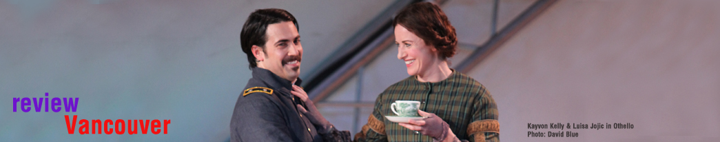 gave credit in a post performance speech) from Kayvon Kelly and From his first moments on stage in the immediate afterglow of his covert wedding to Desdemona to his guilt-ridden final violent scene, Roderique demonstrates both a tangible nobility and contemptuous rage. This even includes Othello’s epileptic seizure, often considered too overwhelming for theatre audiences. Among the actors who have less ground to cover, Andrew Cownden is appropriately pathetic as Desdemona’s overlooked suitor Roderigo. Women get short shrift in Othello, but Kayla Deorksen as the ill-fated Desdemona and Luisa Jojic as the dutiful Emilia make the most of their pivotal roles. There’s just enough to enjoy in Amir Ofek’s versatile scenic elements, without it being a distraction. His set of partially demolished colonial architecture appears to be more in character with the play’s original setting of Cyprus than Charleston. This likely comes about as a result of Ofek having to compromise the design with Bard on the Beach’s alternative production Pericles set in Ephesus. Costume Designer Mara Gottler clothes the players abundantly in the style of the Civil War with Union army uniforms and crinoline petticoats being the most notable features. Sound designer Steven Charles’ personally selected battle hymns and traditional folk tunes probably won’t get the attention they deserve, because of how well his soundscape fits within the production’s context. I am one, sir,