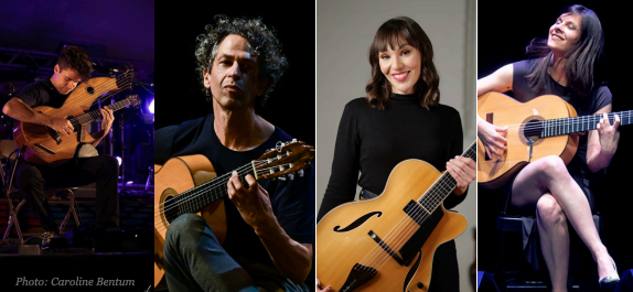 The single night guitar extravaganza has been coming back to Massey Theatre for quite a few years. The 2026 lineup of four talented Canadian guitar players featured Vancouver-based classical and world fusion guitarist Itamar Erez, Winnipeg jazz guitarist and vocalist Jocelyn Gould, Montréal flamenco guitarist Caroline Planté and Northern Ontario innovative harp guitarist Jamie Dupuis. The performance format was an interesting one. The first part, consisted of each artist performing two solo works, while following an intermission, the second part consisted of rotating duets with each musician separately joining two other musical partners and finally the foursome all coming together in a dynamic quartet. First up was Itamar Erez who demonstrate delicate improvisation and melody lines with a couple of his own compositions. There were probably a number of people in the audience who had never seen anyone play a harp guitar. It is certainly an unusual instrument –a hybrid string instrument that combines features of a guitar and a harp. It still features the standard six-string neck, but also features additional open strings at opposite ends of the musical scale. Virtuoso harp guitarist Jamie Dupuis has earned international acclaim for his definitive interpretation of Comfortably Numb, taken from Pink Floyd’s Dark Side of the Moon. I had previously watched this on YouTube, but it’s even better live! Caroline Planté is an anomaly in as much that she is almost unique as a female guitarist who plays her own contemporary flamenco compositions. Planté has trained both in Canada and Spain and on this night she performed two self-penned works that melded modern and traditional styles. Her rasgueado and picado techniques highlighted her fiery passion and rhythmic precision.