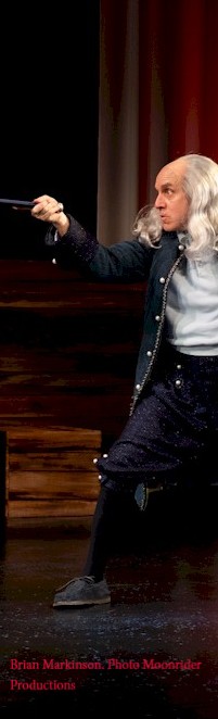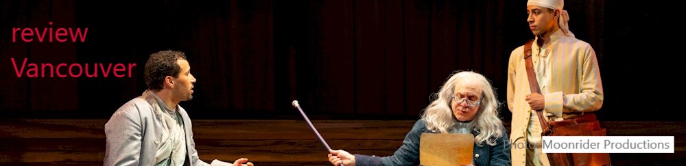 I had hoped, from the title, for a play about the United States, either as Benjamin Franklin imagined it or as it has become since the Revolution. Irreverent comedy or historical drama, either would be welcome. In fact, this play is neither. Instead, the play takes a promising premise -- Franklin’s unsatisfactory relationship with his son -- and fails to use it to examine the relationship of the Nation’s Founding Father and the Nation itself, or to explore real father-son relationships. Instead, Ben Franklin unfailingly tyrannizes and demeans his son. Brian Markinson is very engaging in his boundless enthusiasm and volubility. His eagerness to “steal” electricity from the sky with a kite or explain the Gulf Stream would be infectious if not for his son’s passive-aggressive reluctance. Luc Roderique plays William as the sulky, slow-learner Franklin describes. This is hard to reconcile with William’s competence as a colonial governor and undermines his position as loyal citizen of the country he is sworn to. Historical accuracy can be played with in a work of fiction, but for a purpose. Suh substitutes rheumatism for Franklin’s gout, an extended bout of coughing in a single scene to suggest Franklin’s chronic lung problems, and a fabricated bit of self-help advice which appears to be merely for titillation’s sake. Jakobe Jenkins plays William’s illegitimate son, Temple, a real person, with real charm. Benjamin Franklin undoubtedly had many faults and deficiencies, but his contributions to science, inventions, journalism and literary style and political thought have lasting effect. Cutting a hero down to size is one thing, dismissing accomplishments as unfulfilled is disrespectful. Costumes by CS Fergusson-Vaux are a mixed bag of period and modern wear and suit the play. Steep stairs across the stage dwarf the characters. A central well provides another entrance point and serves as the hold of a ship and a glass-harmonica stand. Scene changes are intimated by gauzy curtains, lighting effects (Jonathan Kim) and suitable tunes of the period, sometimes in modern renditions (Rick Colhoun).